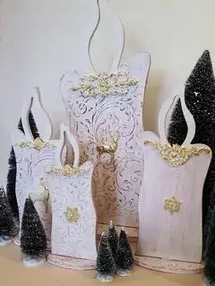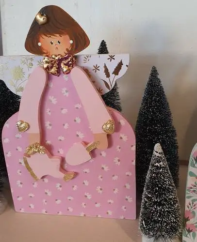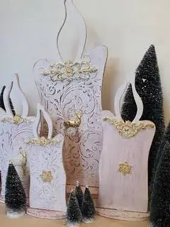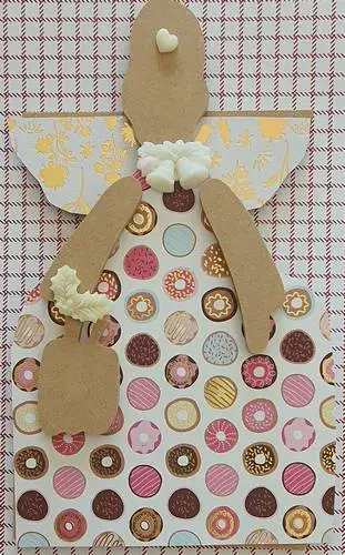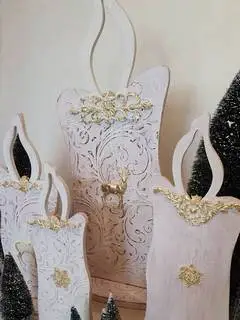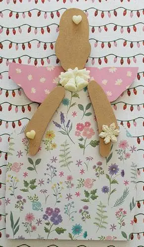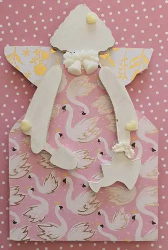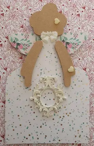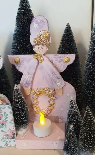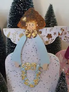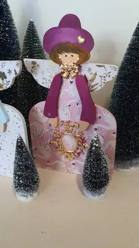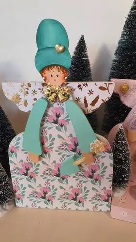• 5 angelitas de 15 cm de alto x 15 cm de ancho, con bases, papeles para forrar sus vestidos, alas y accesorios aplicados como muestra la imagen.